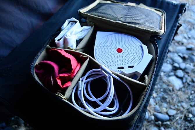 シアター関係の収納ですが、下の写真のような感じでオレゴニアンキャンパーのセミハードギアバックMにプロジェクター、スクリーン、FIRE TV STICK、小物などすべての道具がぴったりと収まります。